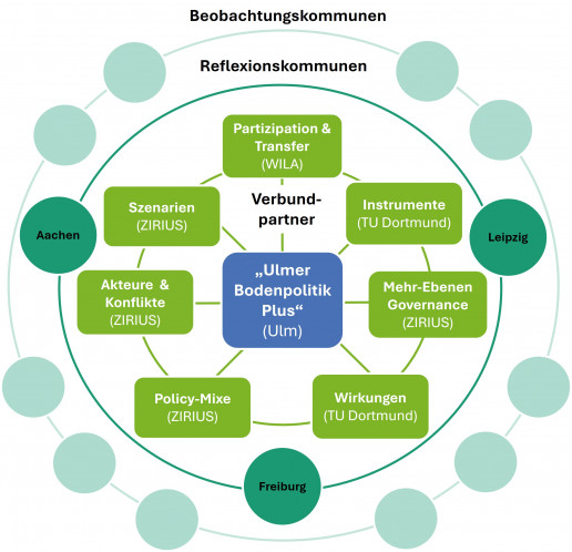 Hierbei arbeiten die Ulmer Stadtverwaltung, die Universität Stuttgart, die TU Dortmund und der Wissenschaftsladen Bonn e.V. eng zusammen. Zudem erfolgt ein intensiver Austausch mit den Reflexionskommunen Aachen, Freiburg und Leipzig. Der Wissenstransfer auf andere Kommunen – u.a. über den Deutschen Städtetag, den vhw Bundesverband Wohnen und Stadtentwicklung e.V. sowie den Kreis Lippe als Vertreter ländlicher Kommunen – ist zentraler Bestandteil des Konzepts.